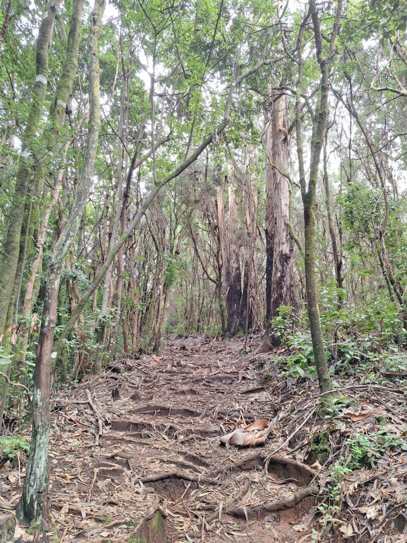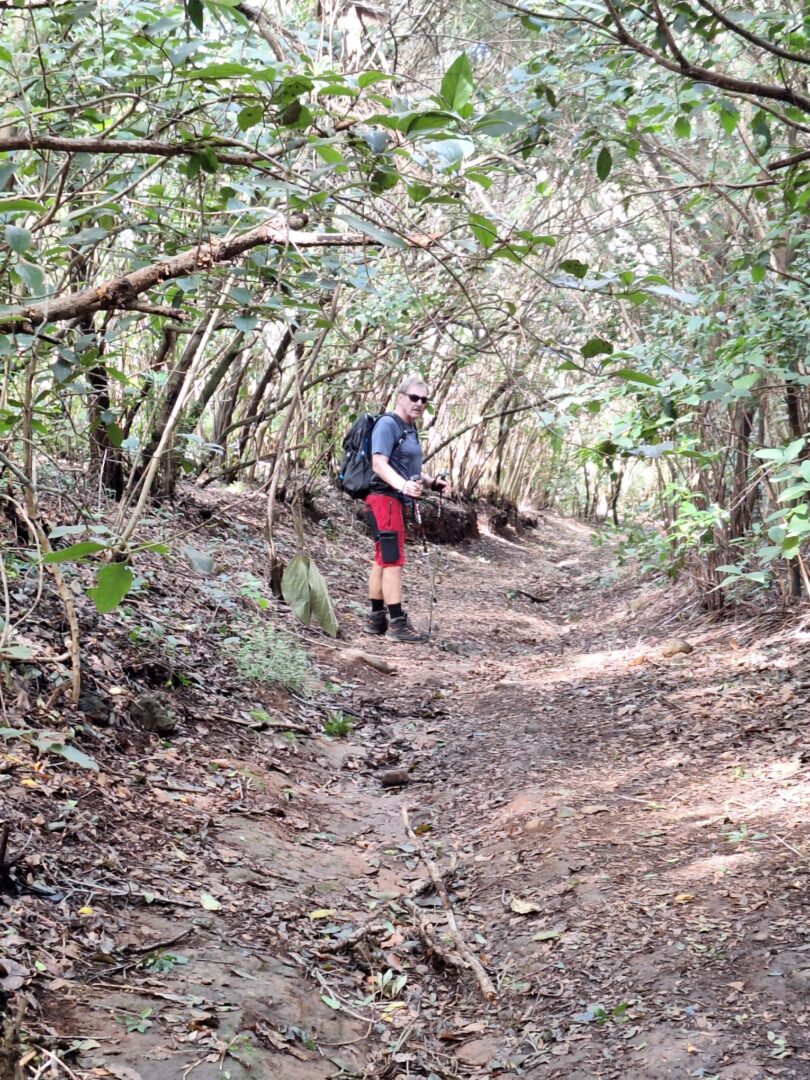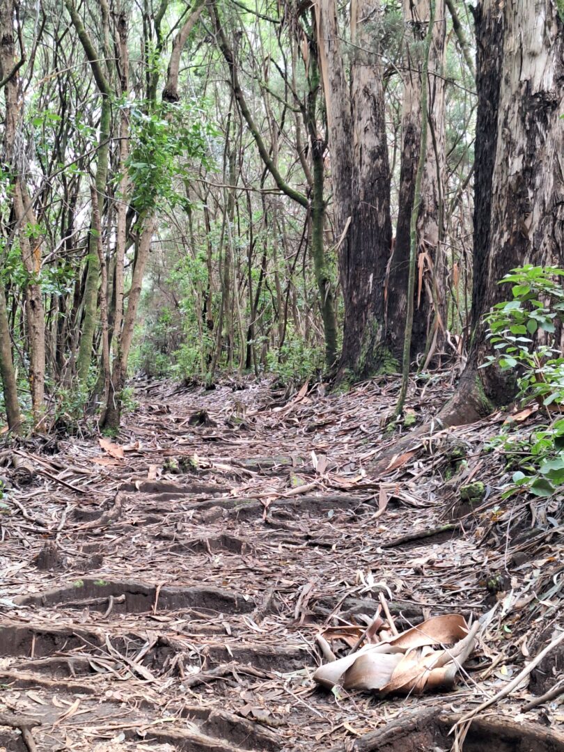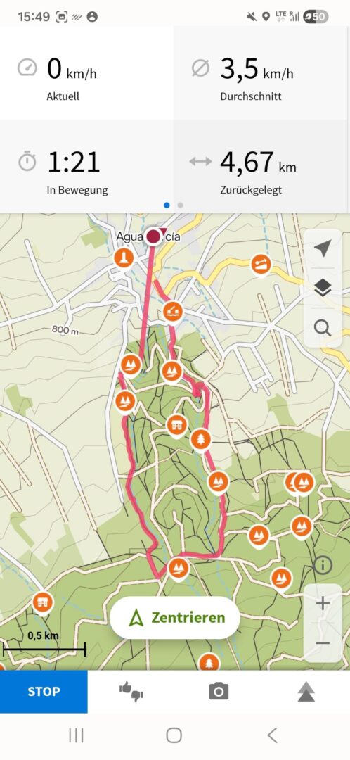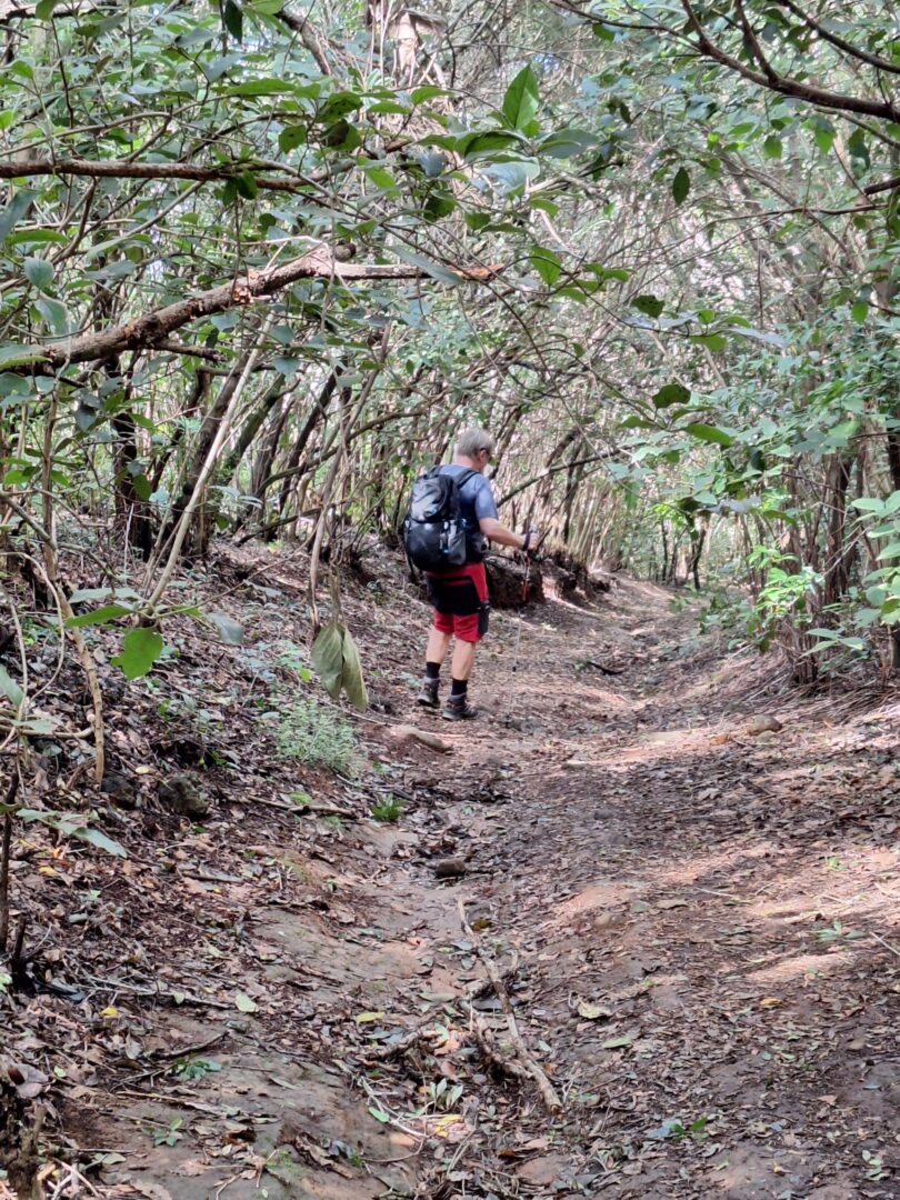 In 750 m Höhe ist es doch sehr kühl, aber da es zunächst wieder steil bergauf geht und die Sonne scheint, ist das sogar ganz angenehm. Der Anfang ist wieder öde, eine sehr steile Teerstraße durch das Dorf, nach 500 m beginnt der Wanderweg. Es ist sehr feucht, man muss aufpassen, dass man nicht ausrutscht. Wir klettern immer weiter nach oben und plötzlich nehmen wir den wunderbaren Eukalyptusduft wahr, gepaart mit der passenden Luftfeuchtigkeit eine wahre Wohltat für die Atemwege. Wir passieren die Kapelle, wo schon lange niemand die vertrockneten Blumen gewechselt hat und von nunan geht’s bergab. Ich weiß nie, was ich weniger mag: steile Anstiege oder steile Abstiege. Diesmal sind es definitiv letztere, denn auf dem lehmigen, nassen Untergrund ist es sehr glitschig und irgendwann sind meine Stiefel mal wieder schneller als ich und ich lande auf dem Po.