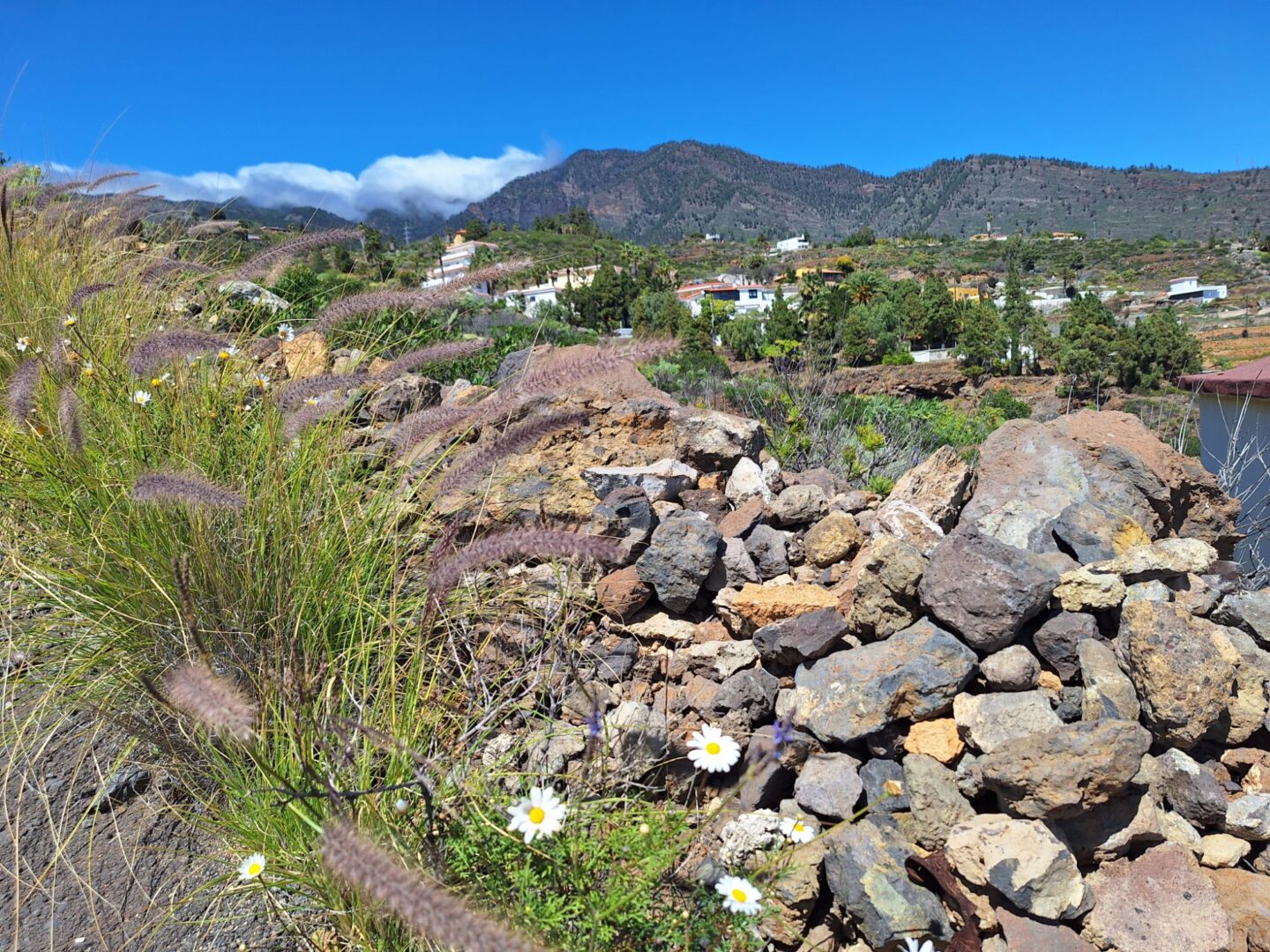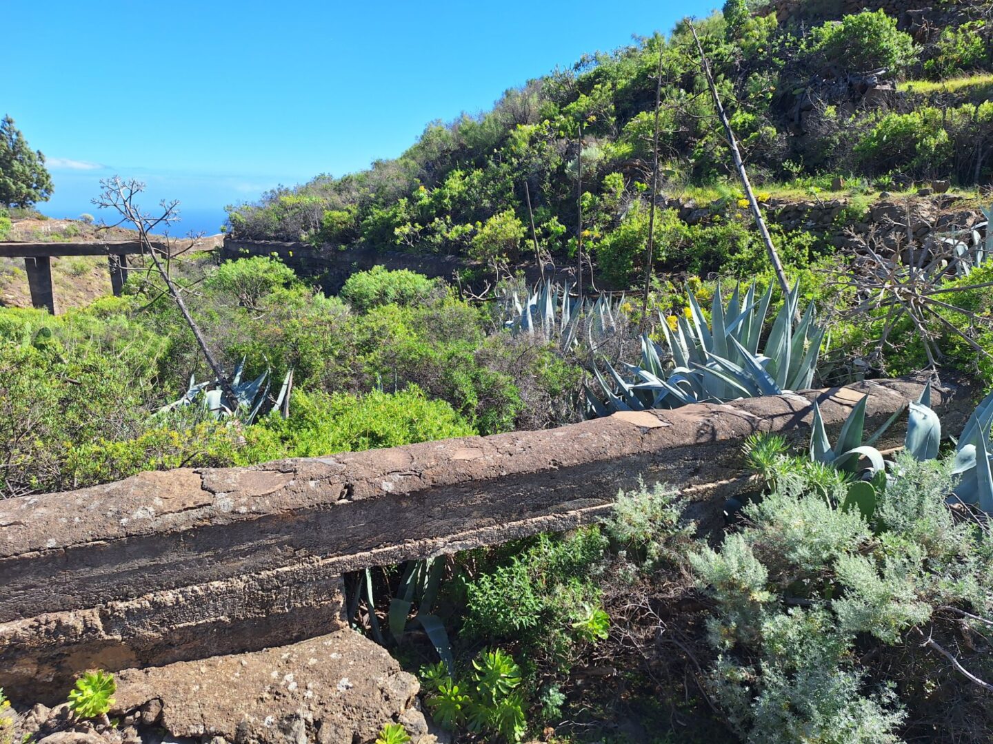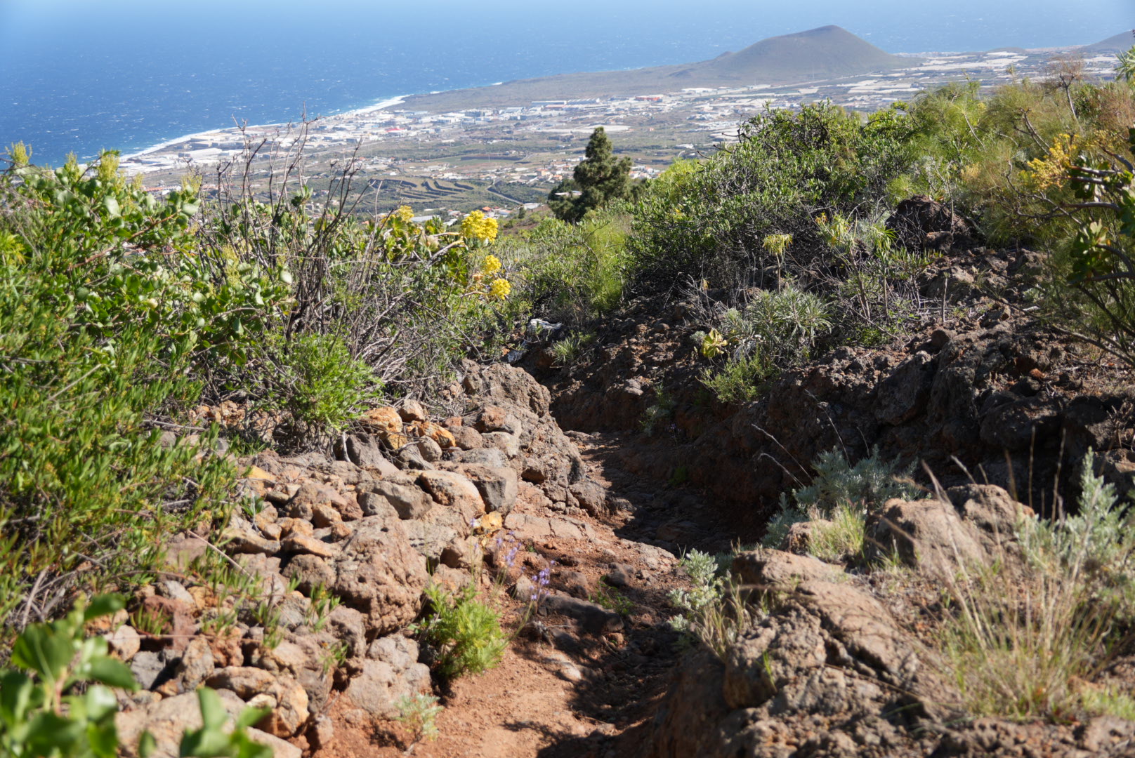 Es geht sehr steil bergauf, vorbei an vereinzelten Häusern, aber unspektakulär. Doch sobald wir den höchsten Punkt erklommen haben, wird es wunderschön. Imposante Barrancos, tolle Aussichten, alte Wasserleitungen und farbenfrohe Vegetation lassen den anstrengenden Aufstieg schnell vergessen . Doch auch der Abstieg ist anspruchsvoll. Unebenheiten und loses Lavageröll lassen uns immer wieder ins Rutschen kommen. Wir schaffen es, nach knapp 3,5 h wieder heil am Auto anzukommen.