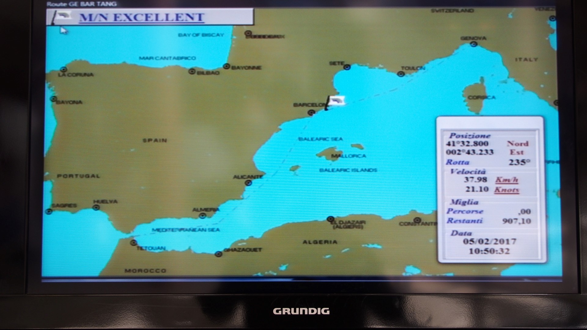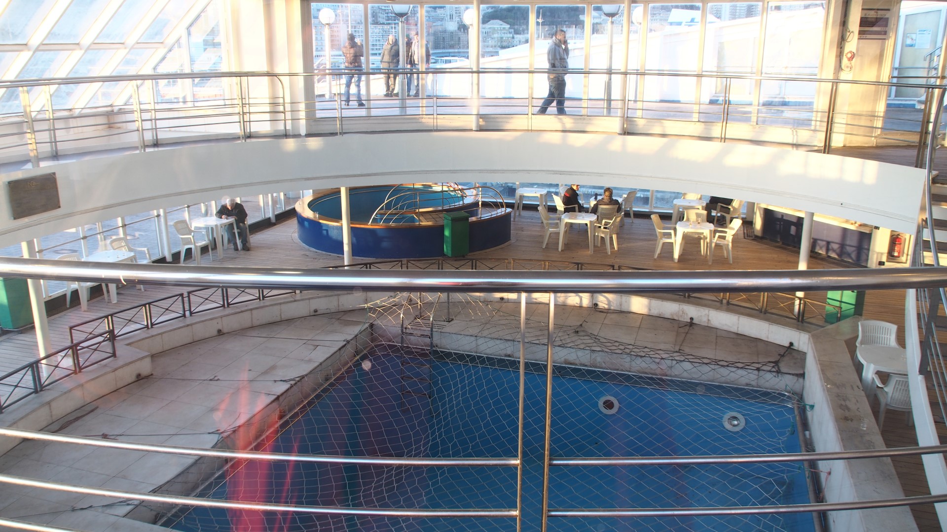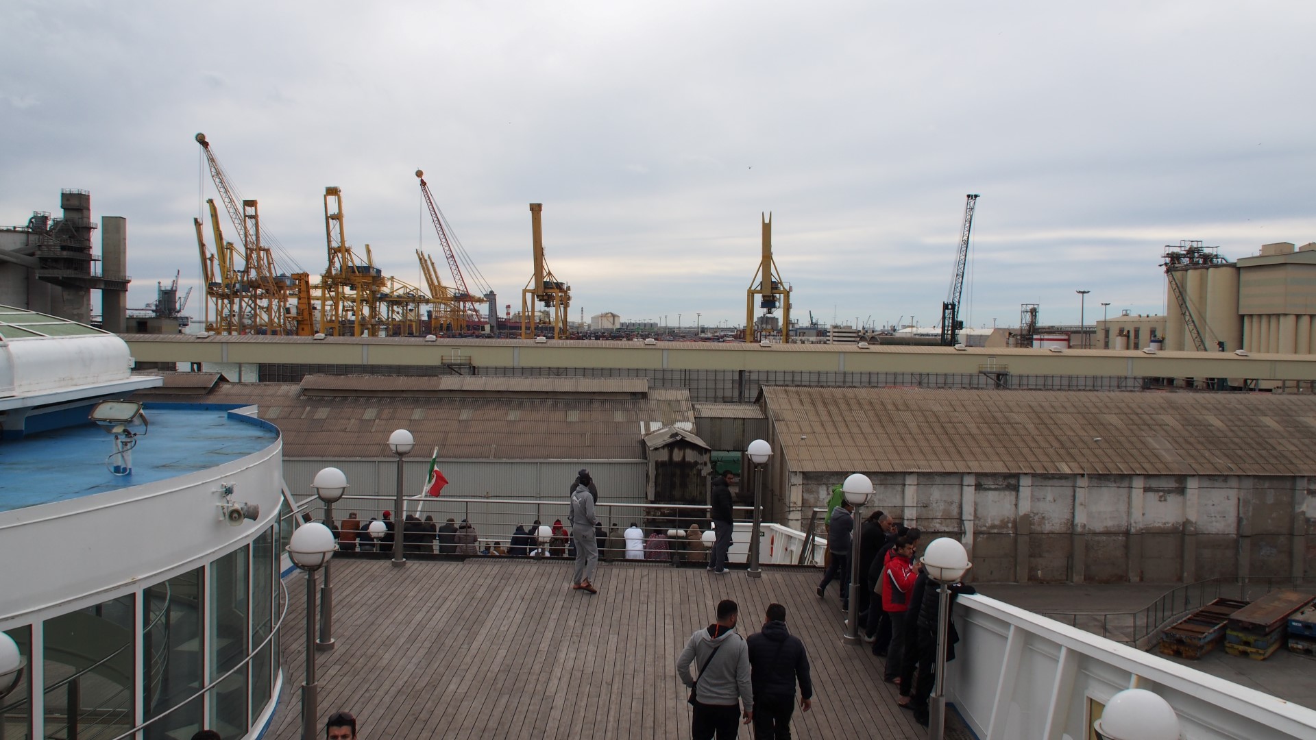 Nach dem Abendessen können wir auf Deck 4 die Personenkontrolle für die Einreise nach Marokko schon erledigen und erhalten dort den Einreisestempel. Am nächsten Morgen hat sich die See weitgehend beruhigt, die Sonne scheint. Es ist zwar noch recht windig, aber gäbe es Deckstühle, könnte man schön in der Sonne sitzen.