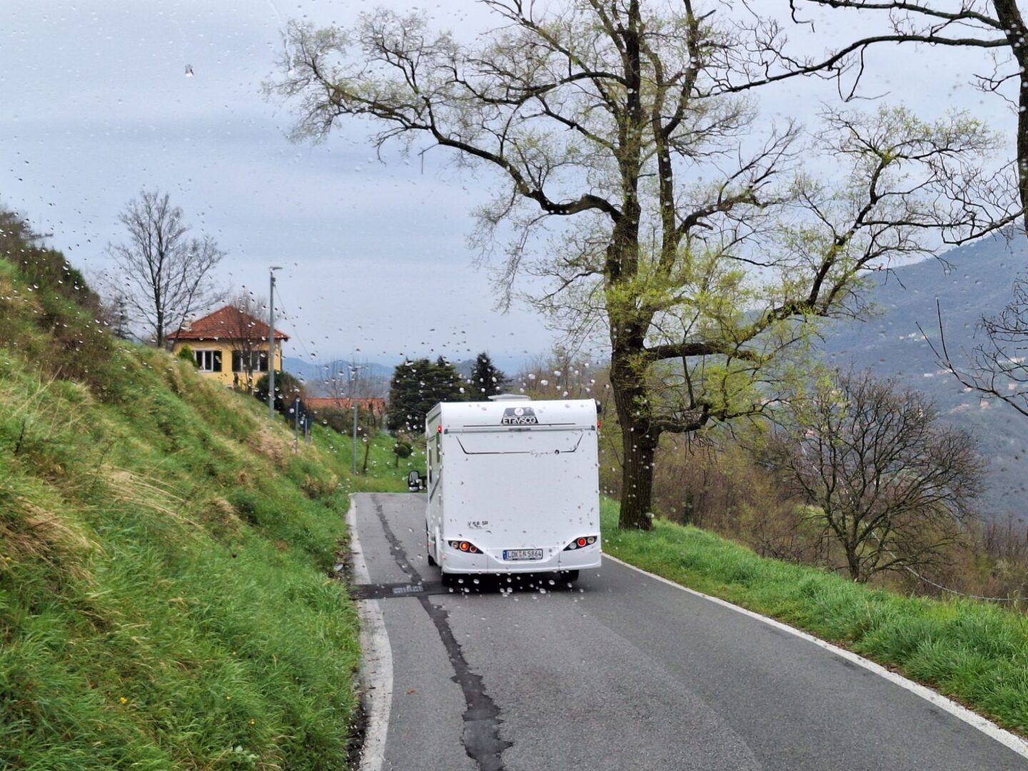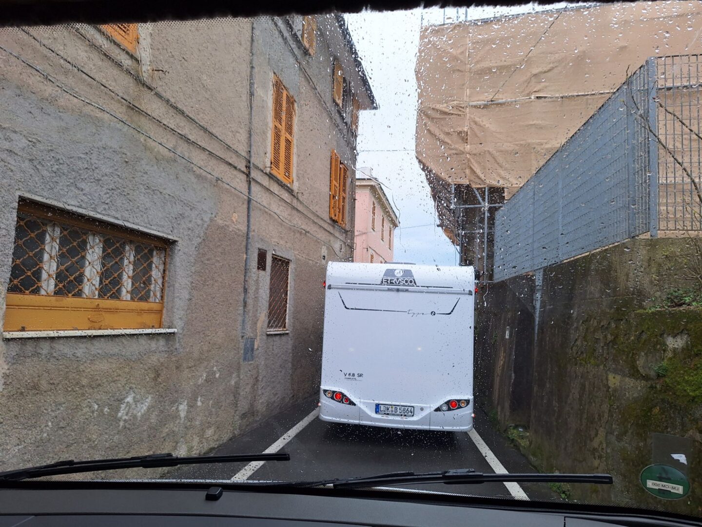 Wieder eine wunderbar ruhige Nacht. Am Samstagmorgen empfängt uns leichter Regen. Wir tuckern über enge bis sehr enge Sträßchen und Gassen durch das wunderschöne Piemont