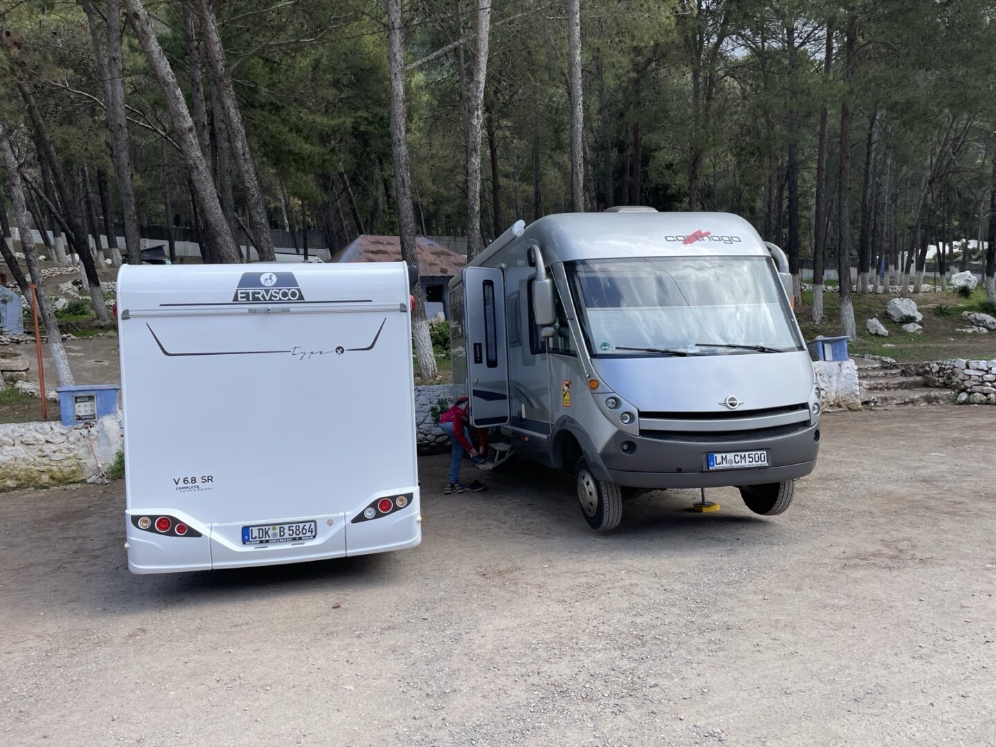 Der Platz ist ziemlich voll, aber wir passen noch in eine Lücke.