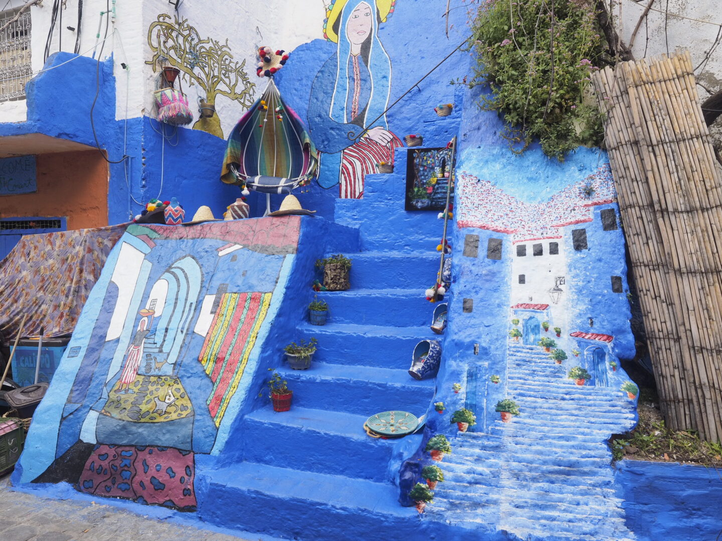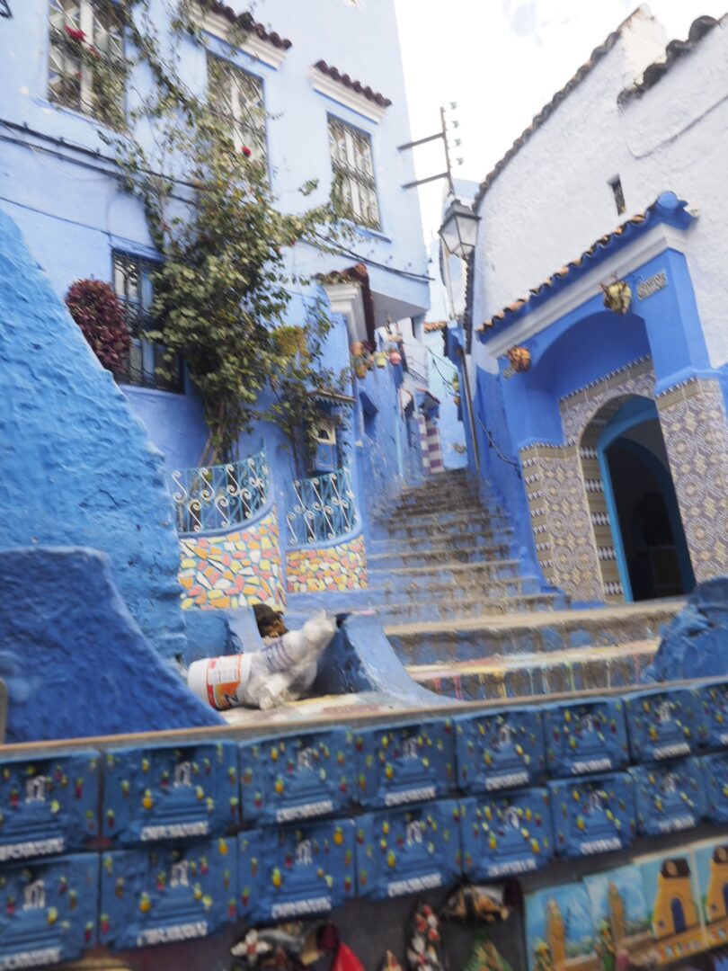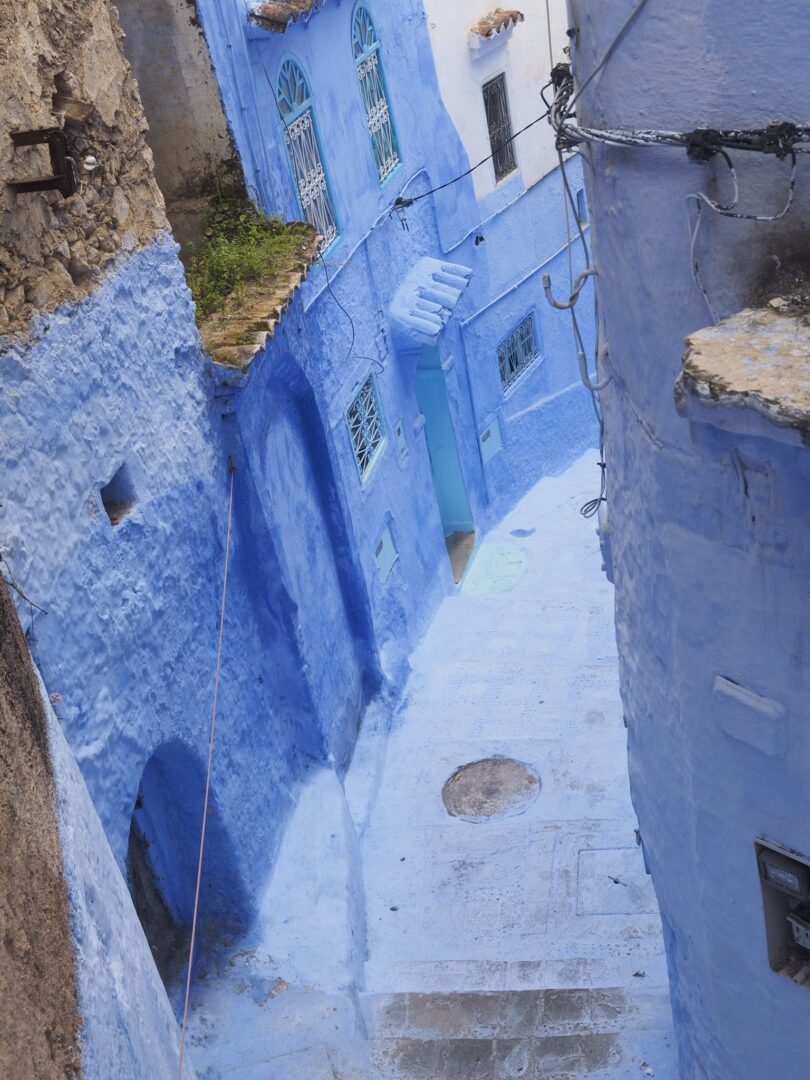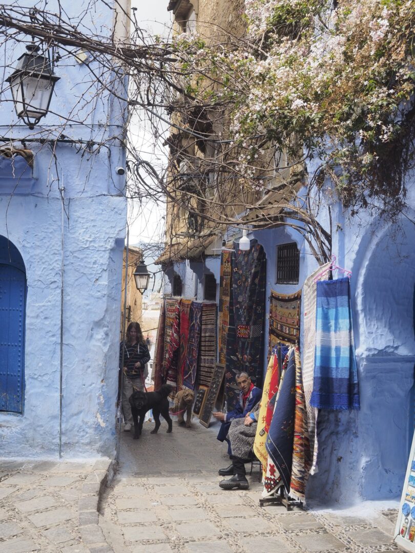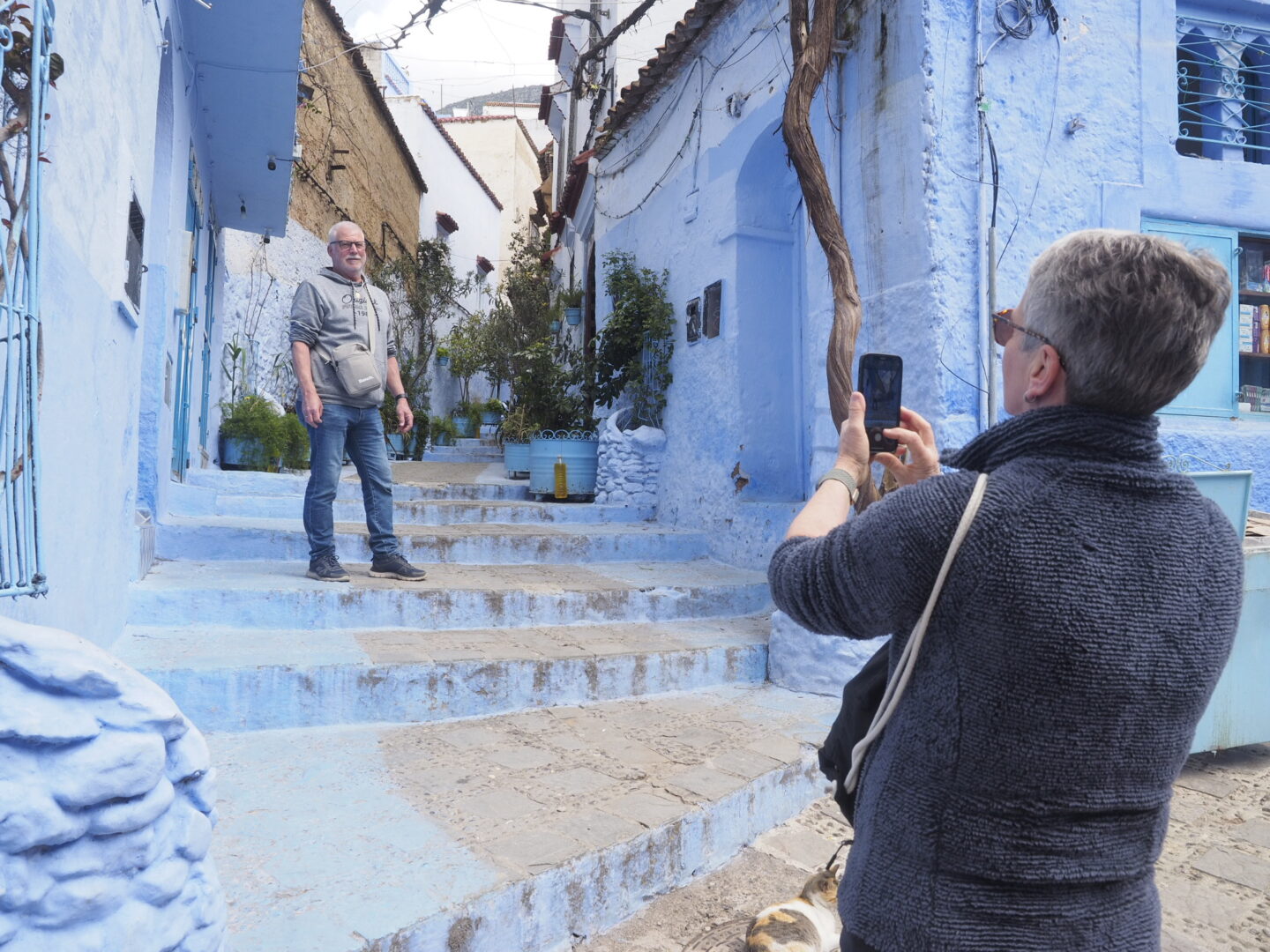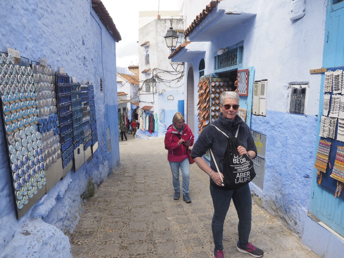 Am nächsten Morgen, Mittwoch, laufen wir steil bergab in die blaue Stadt Chefchauen (dauert ca. 20 Minuten). Blau ist hier die vorherrschende Farbe. Das Städtchen ist noch genauso hübsch wie in unserer Erinnerung und wir genießen den Bummel durch die Gässchen und finden einen Telefonladen, der unser Internet wieder flott macht.