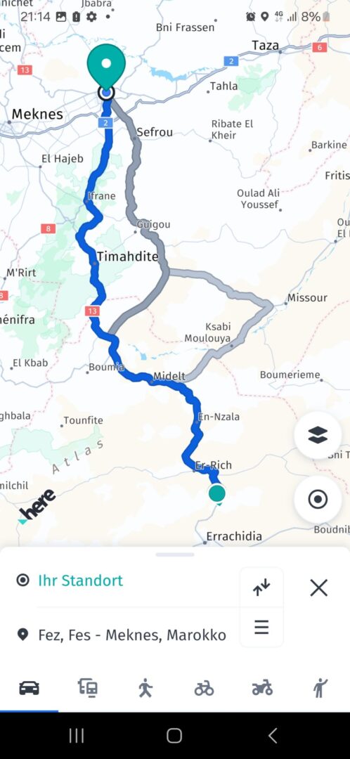 Vom Taxi lassen wir uns zurückbringen und starten gegen 14 Uhr nach Fes, das wir um 18.30 Uhr erreichen – nach einer anstrengenden Fahrt über schlimme Schlaglochpisten.