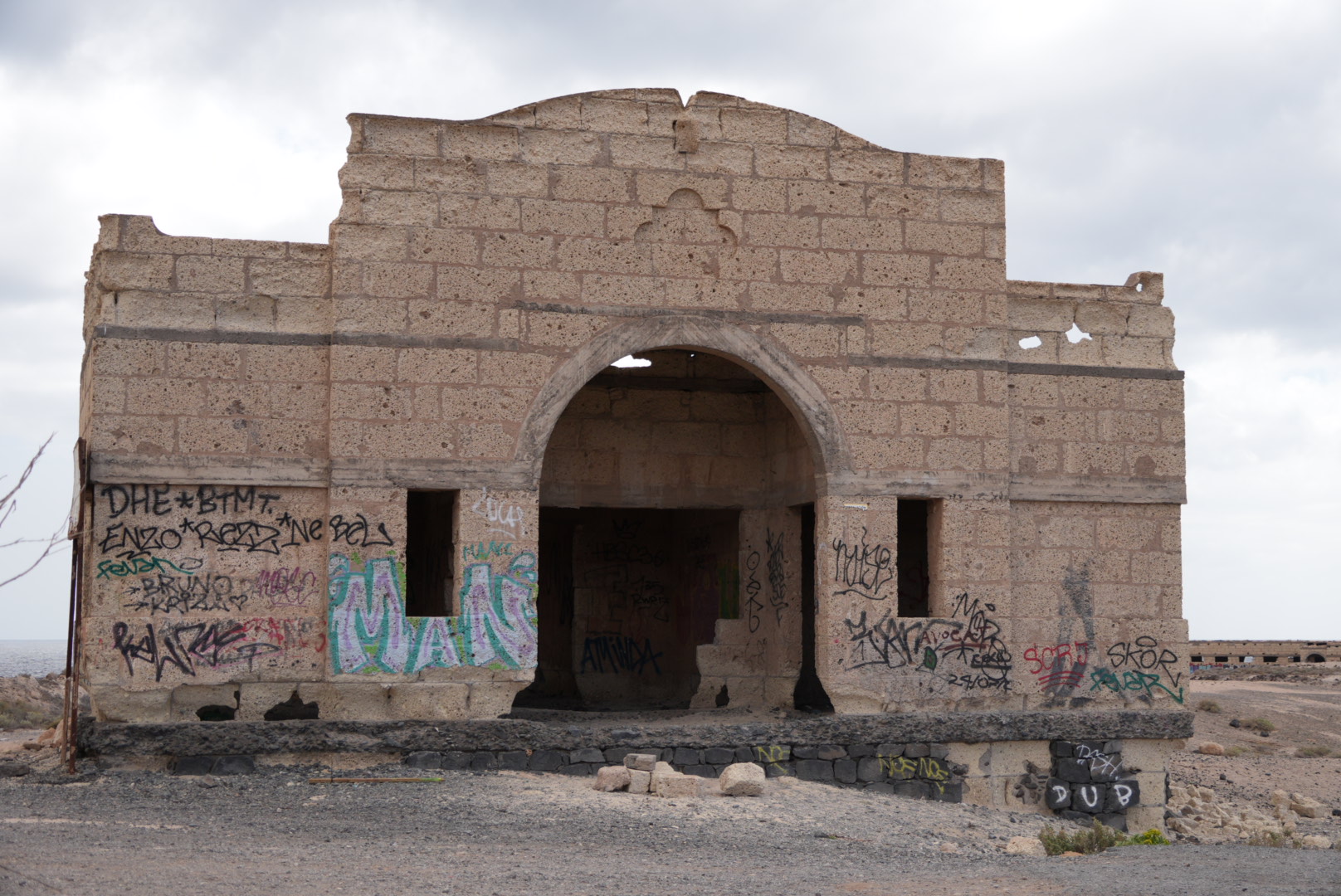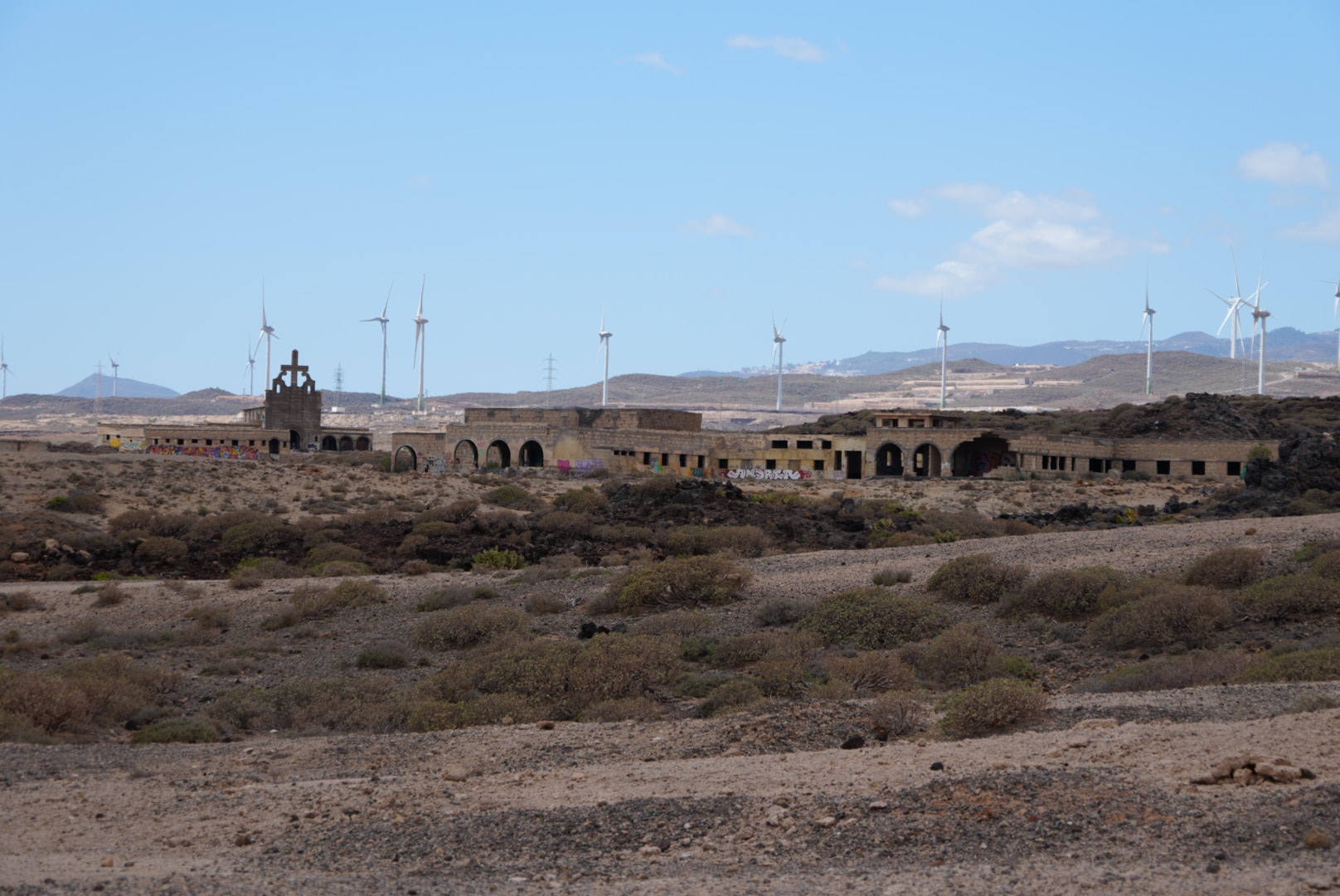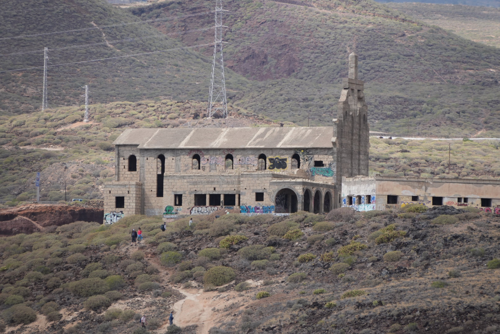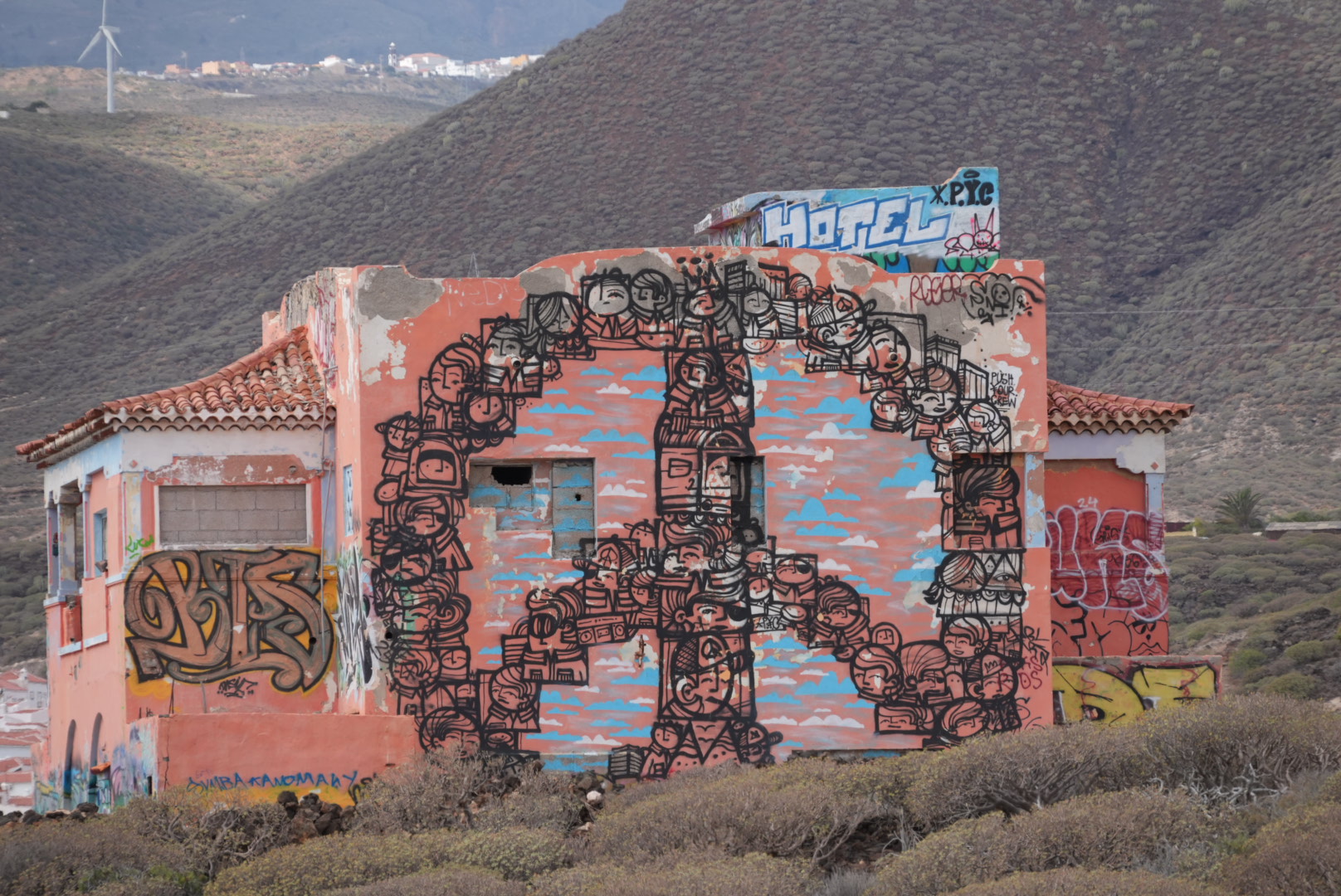 Wieder ist es grau in grau, aber für den Süden ist besseres Wetter vorhergesagt. Also schauen wir uns heute die Geisterstadt bei Punta Abona an. Nach 46 km ist das Ziel bald erreicht. In den 1940er Jahren hat man hier ein Sanatorium / Quarantänestation für Lebrakranke geplant und gebaut, aber noch vor Fertigstellung wurde 1943 ein Heilmittel gefunden (welches???) und der Bau gestoppt. Bis 2000 nutzte das Militär die Gebäude. Heute sind sie verfallen und mit mehr oder minder kunstvollen Graffitis dekoriert. Das Gelände ist frei zugänglich und man kann die verfallenen Häuser besichtigen, z. B. eine Kirche mit einem großen Kreuz sowie ein Krematorium.