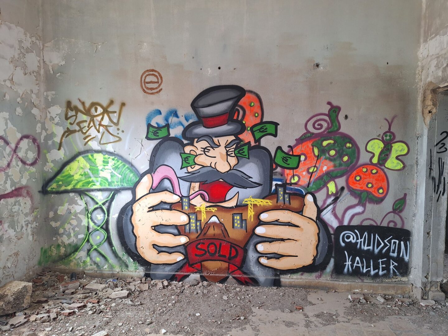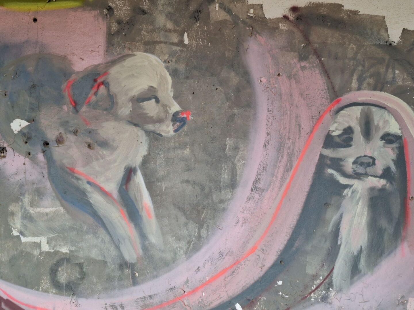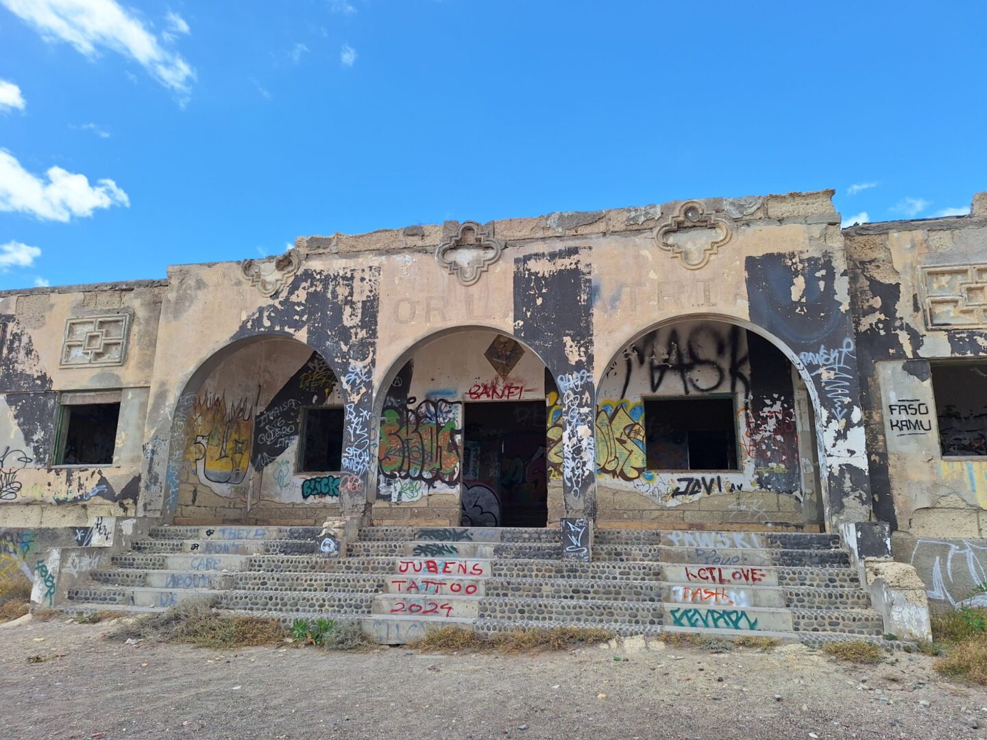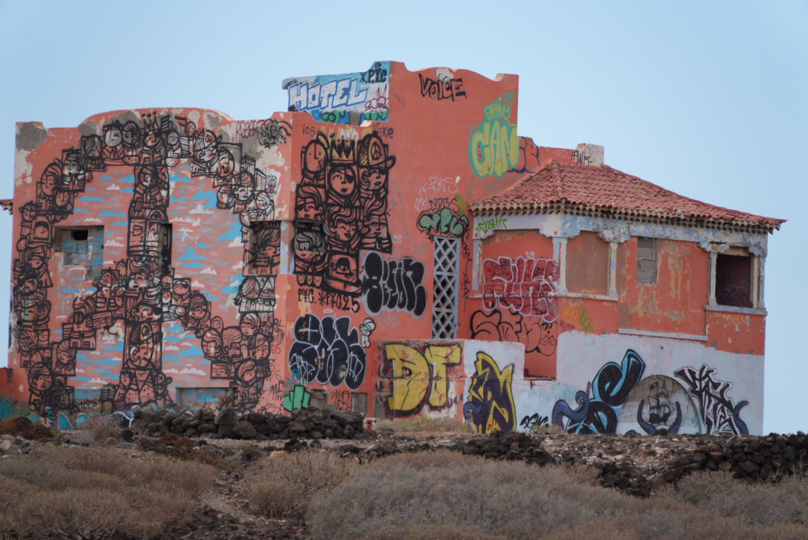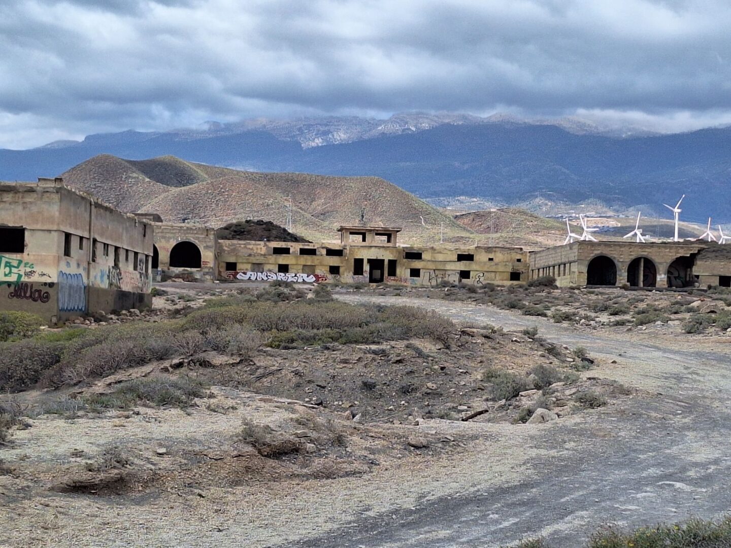 Wieder ist es grau in grau, aber für den Süden ist besseres Wetter vorhergesagt. Also schauen wir uns heute die Geisterstadt bei Punta Abona an. Nach 46 km ist das Ziel bald erreicht. In den 1940er Jahren hat man hier ein Sanatorium / Quarantänestation für Lebrakranke geplant und gebaut, aber noch vor Fertigstellung wurde 1943 ein Heilmittel gefunden (welches???) und der Bau gestoppt. Bis 2000 nutzte das Militär die Gebäude. Heute sind sie verfallen und mit mehr oder minder kunstvollen Graffitis dekoriert. Das Gelände ist frei zugänglich und man kann die verfallenen Häuser besichtigen, z. B. eine Kirche mit einem großen Kreuz sowie ein Krematorium.