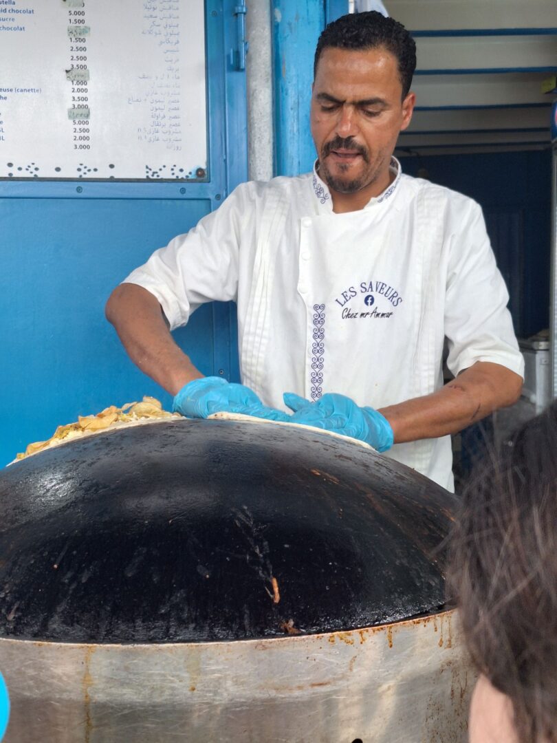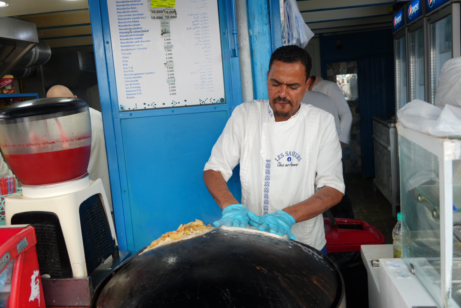 Wir stärken uns mit einem/einer? Manakiche, das ist ein dünner, knuspriger Hefeteigfladen mit verschiedenen Füllungen – sehr lecker.