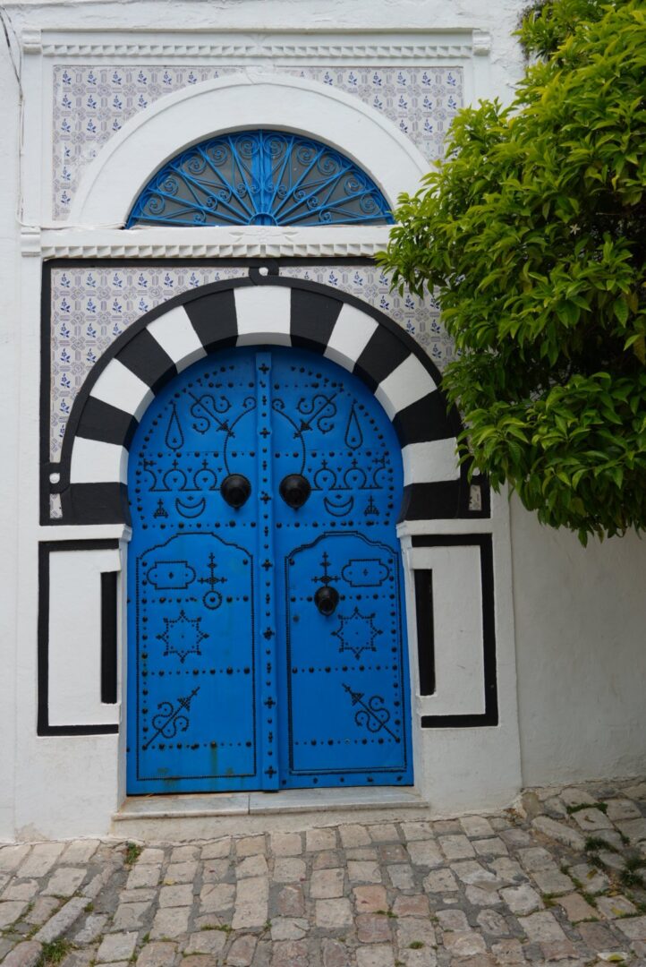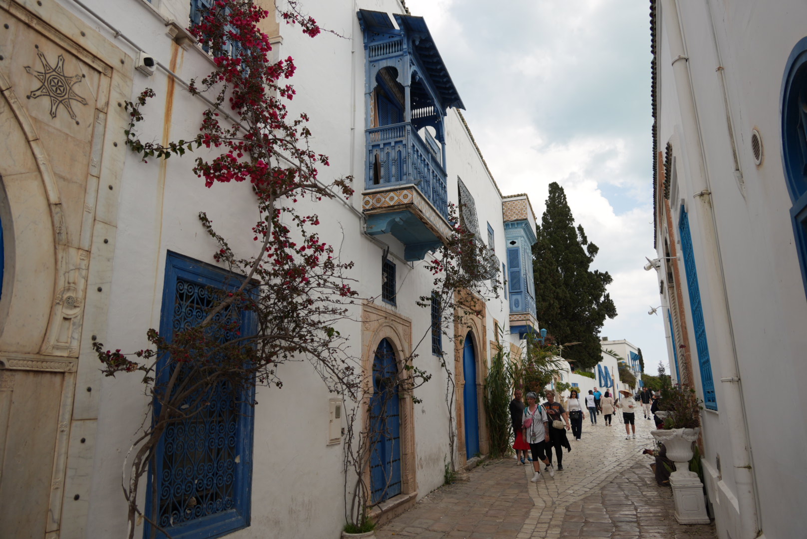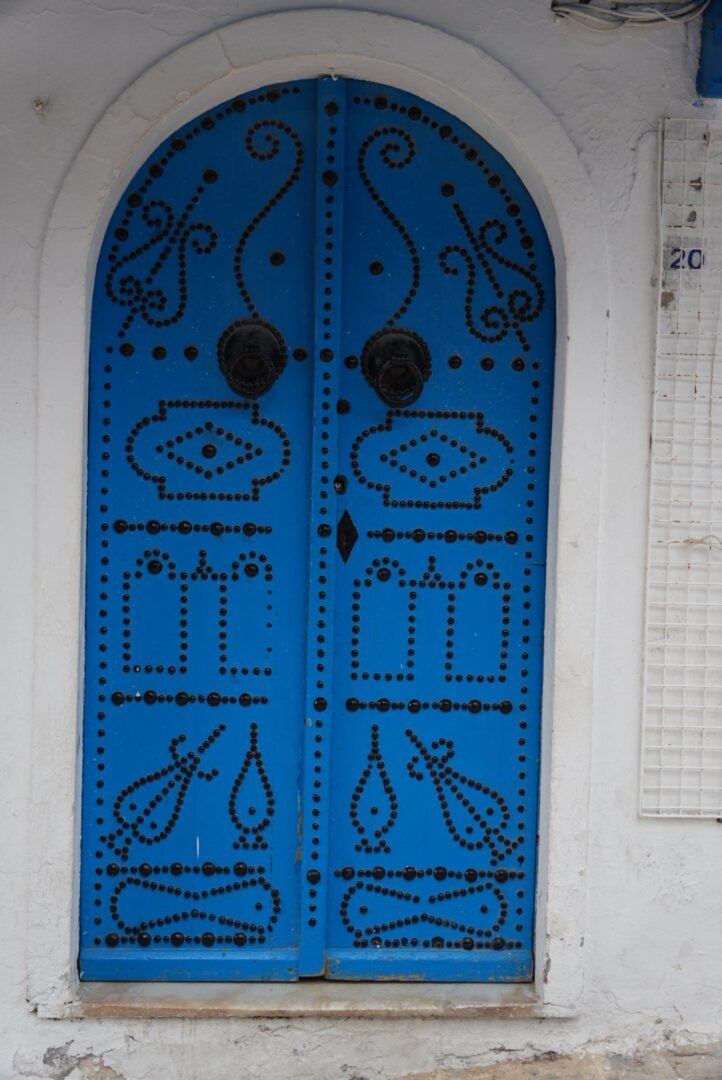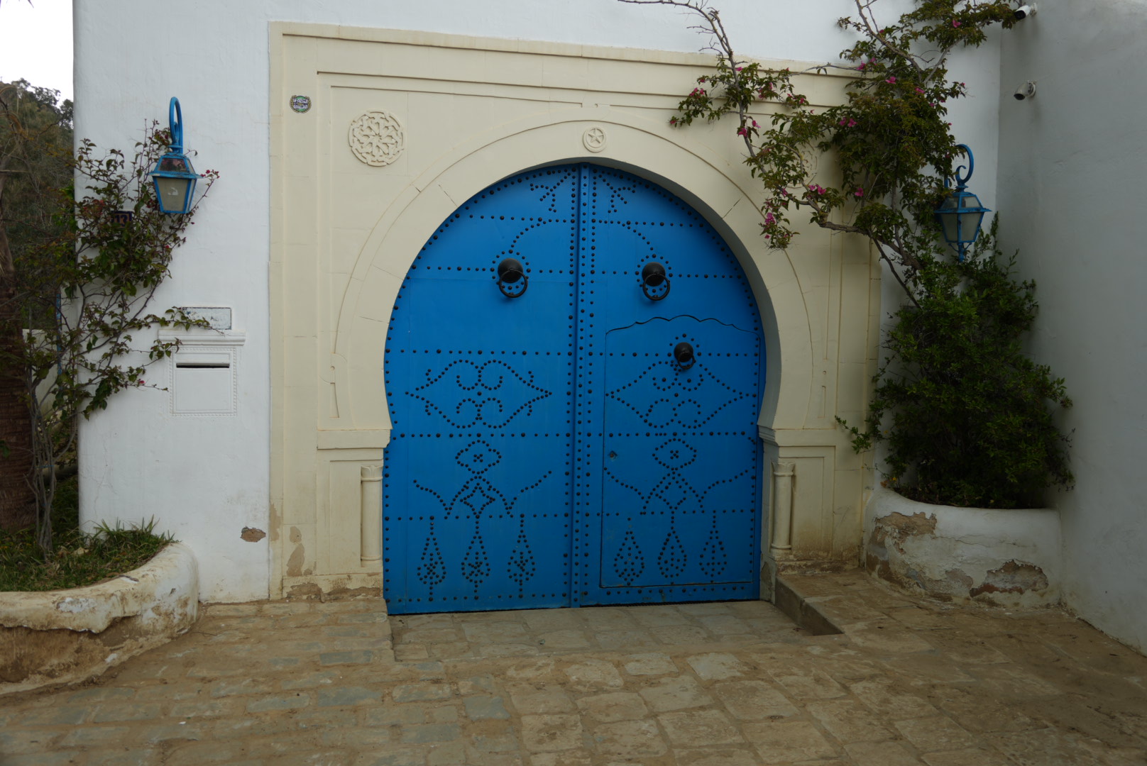 Gegen Mittag laufen wir bergauf in den Ort Sidi Bou Said. Weiß getünchte Häuser, blaue Türen und Balkonbrüstungen sind Markenzeichen, ebenso die Nägel in den Türen, die etwas über den Wohlstand aussagen.