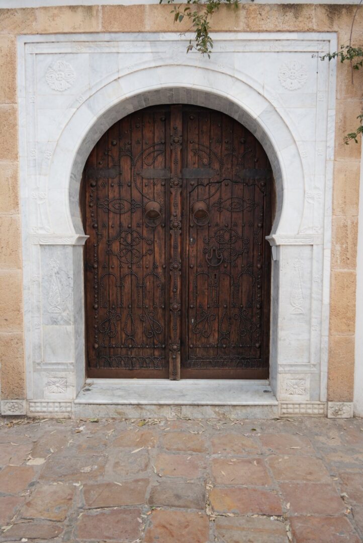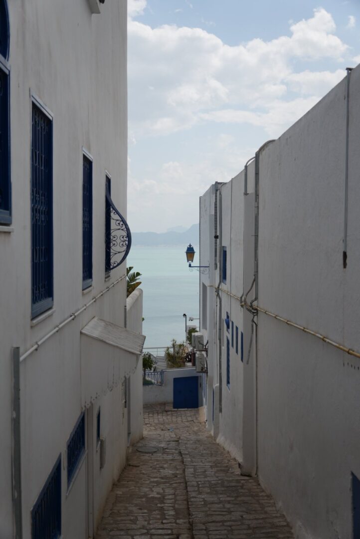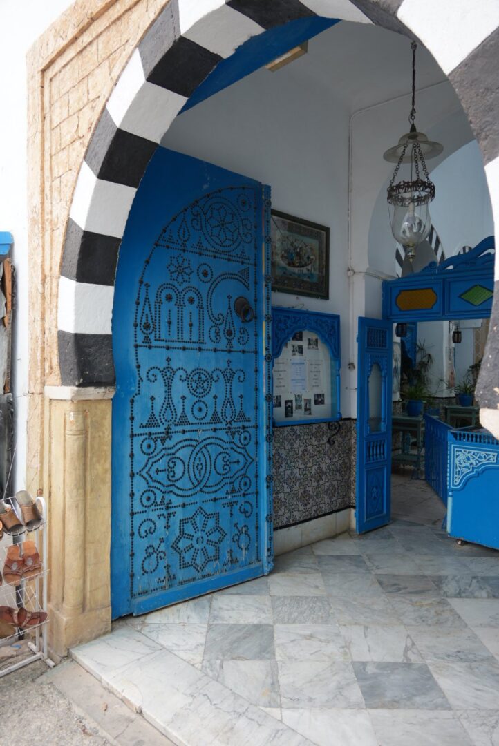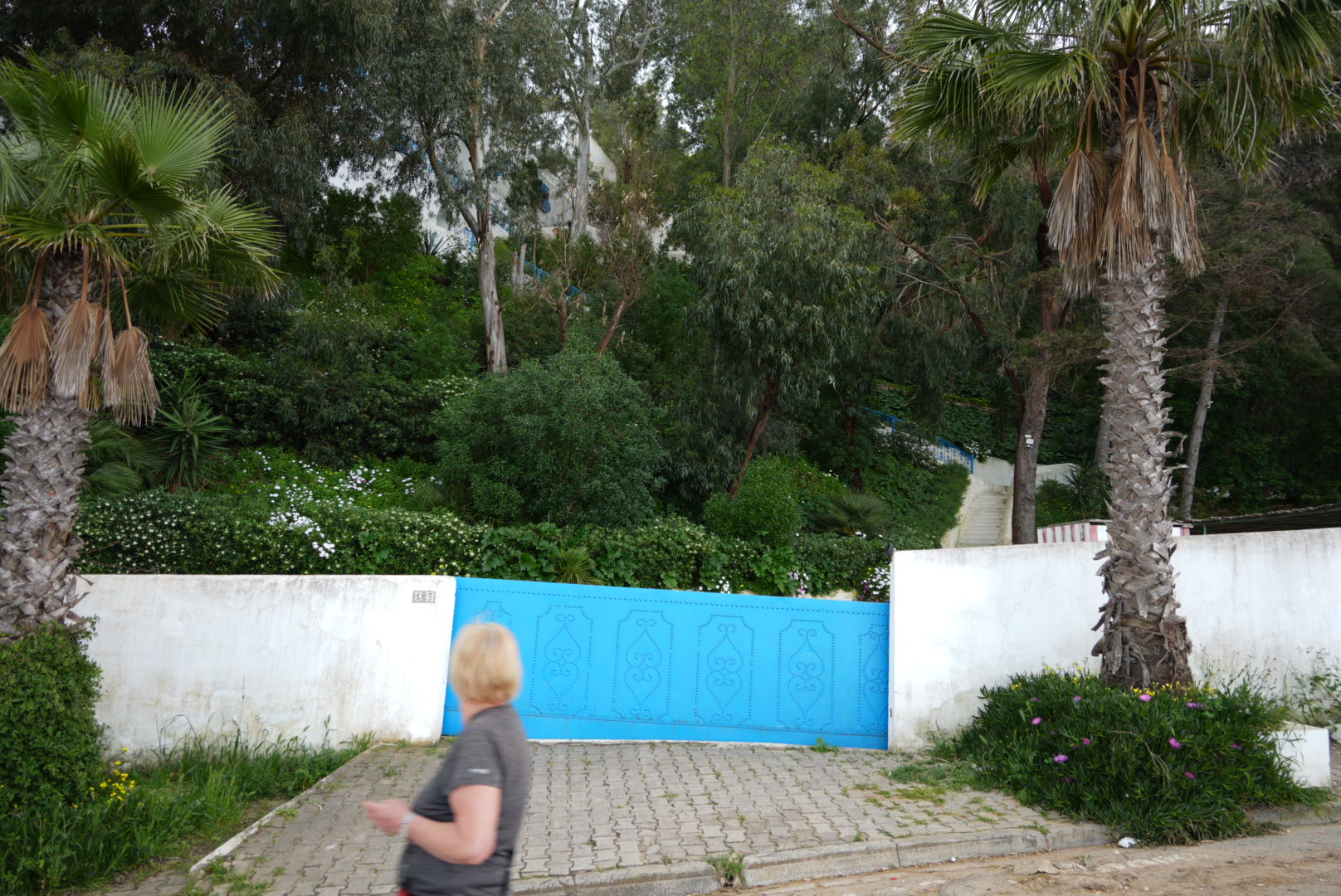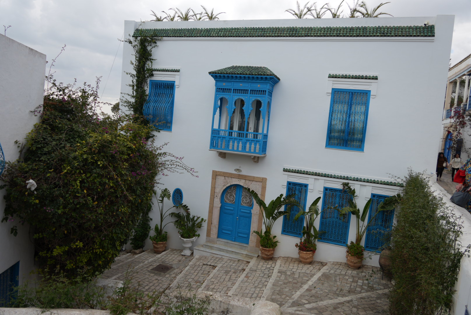 Gegen Mittag laufen wir bergauf in den Ort Sidi Bou Said. Weiß getünchte Häuser, blaue Türen und Balkonbrüstungen sind Markenzeichen, ebenso die Nägel in den Türen, die etwas über den Wohlstand aussagen.