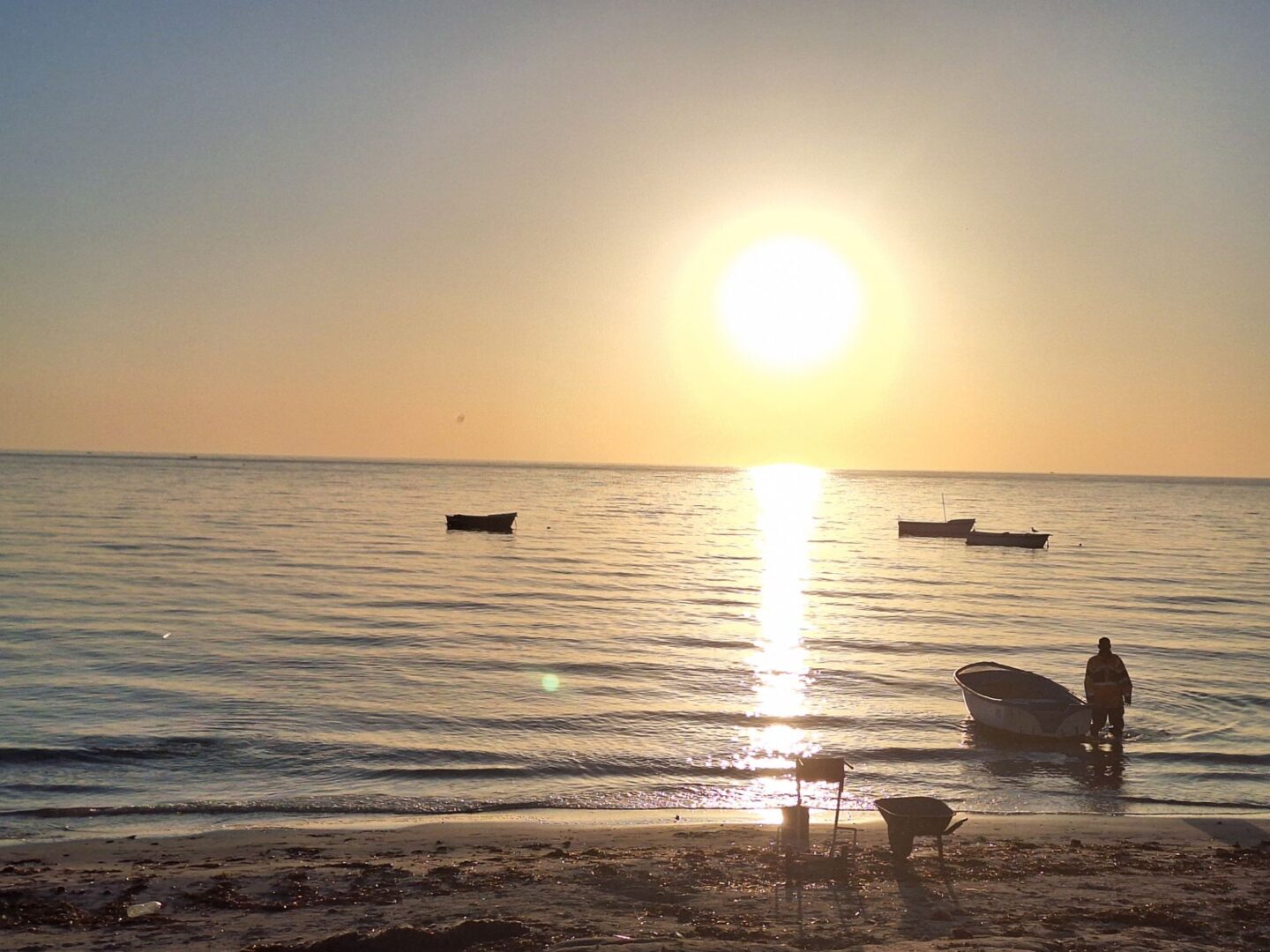 Die ersten Fischer sind schon unterwegs, weitere fahren gerade hinaus. Seit vor kurzem ein Fischerboot gestohlen wurde und mit Flüchtlingen nach Italien gefahren ist, nehmen die Fischer nach der Rückkehr Tank und Motor aus ihren Booten und fahren sie auf alten verrosteten Schubkarren nach Hause.